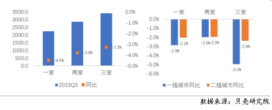 根據(jù)貝殼研究院數(shù)據(jù),全國(guó)重點(diǎn)40城中,兩居室仍然是成交主力,占比超過(guò)40%,今年三季度三居室占比首次超過(guò)了一居室,達(dá)到28.2%,其中一線城市、二線城市一居室、兩居室租賃成交占比均有不同程度的減少。一方面,由于房地產(chǎn)購(gòu)房交易市場(chǎng)影響,延遲購(gòu)房“購(gòu)轉(zhuǎn)租”的租賃需求增加,這一部分多是家庭型租賃需求,家庭型租客由于考慮到父母、子女的居住需求,會(huì)更傾向于選擇大戶型。另一方面,由于保障性租賃住房、市場(chǎng)化集中式公寓項(xiàng)目的入市,分流了部分小戶型的租賃需求。