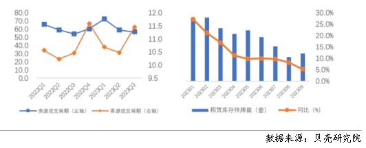 根據(jù)貝殼研究院數(shù)據(jù),全國(guó)重點(diǎn)40城三季度房客源成交周期分別為56.7、11.5天,房源成交周期環(huán)比減少2.1天,同比增加2.7天;客源成交周期環(huán)比延長(zhǎng)1天,同比延長(zhǎng)1天。隨著個(gè)人租賃房源供應(yīng)的增加,疊加保障性租賃住房、市場(chǎng)化集中式租賃房源的增加,個(gè)人業(yè)主出租房源出租速度減緩。從庫(kù)存房源來(lái)看,今年1-9月租賃庫(kù)存房源量均呈現(xiàn)同比增加的趨勢(shì),與此同時(shí),租客租房面臨的選擇項(xiàng)增多,租客對(duì)于租賃房源可選類(lèi)型和房源量均有增加。