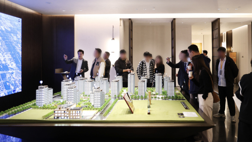 (北京房山區(qū)華潤京熙潤府售樓處沙盤前看房人群絡繹不絕)