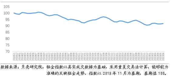 同樣,貝殼研究院數(shù)據(jù)顯示上半年租金成交價(jià)保持相對平穩(wěn),不過仍略低于去年同期。從租金成交價(jià)水平來看,2023年上半年重點(diǎn)40城月租金水平為36.6元/平米,比去年上半年下跌1.2%;套均月租金為2896.3元/套,與去年同期基本持平。雖然住房租賃市場活躍度較高,但隨著住房租賃市場個(gè)人業(yè)主房源、住房租賃企業(yè)房源供應(yīng)量的持續(xù)增加,租金成交價(jià)水平整體低于上年同期。從成交價(jià)月度租金指數(shù)來看,除4月外,其余月份租金指數(shù)均環(huán)比穩(wěn)中微漲。不過與上年同月相比,上半年各月租金同比仍下跌,跌幅在1.0%-2.4%之間。