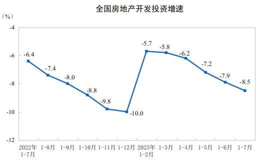 1—7月份,全國房地產(chǎn)開發(fā)投資67717億元,同比下降8.5%;其中,住宅投資51485億元,下降7.6%。