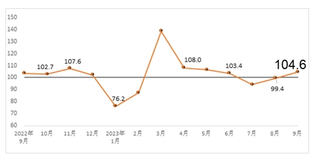 據(jù)中國(guó)建筑材料聯(lián)合會(huì)發(fā)布的數(shù)據(jù)顯示,2023年9月份建筑材料工業(yè)景氣指數(shù)為104.6點(diǎn),較上月回升5.2點(diǎn),高于臨界點(diǎn),處于景氣區(qū)間,建筑材料工業(yè)運(yùn)行有所恢復(fù)。
