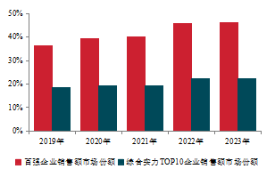 報告顯示,2023年,百強企業(yè)銷售總額、銷售面積分別達53896.0億元、26131.6萬平方米。 百強企業(yè)市場份額為46.2%,較上年微增0.4個百分點。