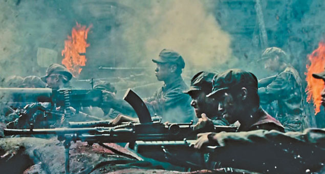 相比于以往表現(xiàn)毛澤東同志革命故事的作品,此次《浴血榮光》在如何表現(xiàn)建軍過程的影像上下了很大功夫。導演陳力做了精心設(shè)計,她讓影像不僅還原歷史,還富有更為深刻的寓意。比如,毛澤東在湖南發(fā)動秋收起義前,前往萍鄉(xiāng)安源煤礦的兵工廠,和工農(nóng)兄弟一起鍛造鐮刀與斧頭等武器,他在畫面的黃金分割點慷慨演說,鋼鐵熔爐里火紅的光芒照射在他身上,充滿油畫般的力量感和造型感,也寓意著人民軍隊就誕生于工農(nóng)中。