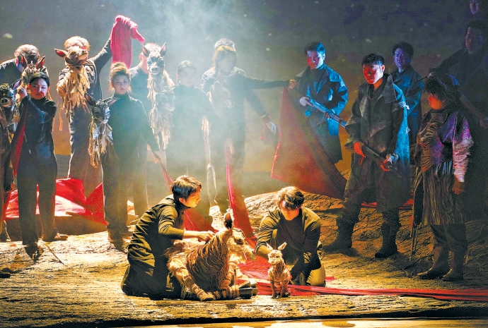 在舞臺(tái)呈現(xiàn)上,舞美設(shè)計(jì)常煒以“山的血脈”為核心意象,山體內(nèi)部的紋理宛若血液流動(dòng),山石土地俱在跳動(dòng)、呼吸。整體來(lái)說(shuō),《可可西里》的舞臺(tái)置景變化并不劇烈,燈光、景片以及經(jīng)幡等裝飾以恰到好處的力度表明時(shí)間地點(diǎn)的轉(zhuǎn)換,暗喻劇情和人物內(nèi)心的走向——在有些舞臺(tái)作品選擇以噱頭和炫技招攬觀眾的當(dāng)下,《可可西里》流淌著一種久違的、質(zhì)樸的暖意,主創(chuàng)團(tuán)隊(duì)為這部作品付出了足夠的誠(chéng)意,比如,無(wú)論是電影《可可西里》,還是人們對(duì)這片凈土的既有認(rèn)知,動(dòng)物都在其中扮演重要的角色,但毫無(wú)疑問,要在舞臺(tái)上把動(dòng)物塑造得真實(shí)且有藝術(shù)表現(xiàn)力,并不容易。主創(chuàng)團(tuán)隊(duì)沒有偷工減料地繞過(guò)這個(gè)難題,而是以模仿動(dòng)物習(xí)性的“偶”代替,當(dāng)從“母羊”的腹中剖開一卷鮮紅的長(zhǎng)綢,“小羊”跌跌撞撞地學(xué)著起身時(shí),溫柔灑落的天光配合層層遞進(jìn)的音樂,把現(xiàn)場(chǎng)氣氛推向一次動(dòng)人的高潮。
