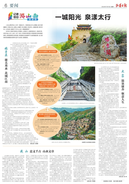 遠(yuǎn)眺大汖古村,房屋依山而建鱗次櫛比。 人說山西好風(fēng)光,左手一指是太行。陽(yáng)泉地處太行山西麓,自古為晉冀要沖、形勝之地,這里山川疊翠、風(fēng)光旖旎,歷史悠久、底蘊(yùn)深厚,物華天寶、人杰地靈,被譽(yù)為“太行山上的一顆璀璨明珠”。 近年來,陽(yáng)泉市堅(jiān)持以文塑旅、以旅彰文,加強(qiáng)頂層設(shè)計(jì)、高端引領(lǐng),依托長(zhǎng)城、太行、古村、工礦、生態(tài)、紅色等豐厚資源,積極探索文旅發(fā)展新路徑,多維度擦亮文旅品牌,持續(xù)推動(dòng)文旅康養(yǎng)產(chǎn)業(yè)高質(zhì)量發(fā)展,全力把獨(dú)特資源稟賦優(yōu)勢(shì)轉(zhuǎn)化成產(chǎn)業(yè)優(yōu)勢(shì)、發(fā)展勝勢(shì)。 娘子關(guān) 雄關(guān)秀水 北域江南 從陽(yáng)泉市區(qū)出發(fā),沿315省道、太行一號(hào)旅游公路驅(qū)車40公里,便到達(dá)平定縣娘子關(guān)鎮(zhèn)。 作為國(guó)家4A級(jí)景區(qū),娘子關(guān)以雄關(guān)、險(xiǎn)道、崇山、秀水而聞名,“天下第九關(guān)”的雄偉和“北國(guó)小江南”的輕柔讓娘子關(guān)的美有了別樣韻味。 進(jìn)入景區(qū),首先映入眼簾的是雄偉的關(guān)樓。娘子關(guān)的城堡,背依高接云天的嵯峨綿山,面臨澗壁如削的萬丈深峪,山腰的垣堞,隨山勢(shì)蜿蜒,桃河環(huán)繞其西北,曲折奔流,“襟山帶水,金城湯池”,整個(gè)關(guān)城兩翼是依山勢(shì)蜿蜒起伏的長(zhǎng)城,歷史上成為山西、河北兩省間的天然屏障。 古關(guān)城樓,由巨大的青石塊砌成門洞,樓上匾額一行大字:天下第九關(guān)。 關(guān)樓下,路面由巨大青石塊鋪就,歷經(jīng)千年風(fēng)雨磨損,已是光滑锃亮。行走其間,似乎能聽到戰(zhàn)馬嘶鳴、炮火隆隆,看到戰(zhàn)旗獵獵、戰(zhàn)士挺立。這條千年古道沿用至今,述說著厚重的歷史。 穿過門洞,一條小街。石墻石階,古木門楣,青石小路,彎彎曲曲,高低不平。陽(yáng)光灑滿街道,守關(guān)將士的后人們,在這兒過著恬淡的生活。推門,每個(gè)院子里,都有屬于守關(guān)將士們獨(dú)特的故事。 關(guān)樓頂上,一尊彩塑,干練中透露出女性特有的嬌媚。李淵長(zhǎng)女,也是李世民姐姐,平陽(yáng)公主。駐守雄關(guān)時(shí),平陽(yáng)公主訓(xùn)練了一支女兵隊(duì)伍,個(gè)個(gè)英姿颯爽,曾在這里守關(guān),娘子關(guān)亦由此得名。 走過雄關(guān),穿越花海,循著潺潺水聲,便到了“娘子關(guān)瀑布”。 娘子關(guān)擁有華北地區(qū)最大的巖溶泉泉域面積3600平方千米,泉水集中區(qū)域?yàn)槟镒雨P(guān)、河灘等5個(gè)村,總面積22平方千米,大量不間斷的泉水融入瀑布,沿著懸崖傾瀉而下。西北側(cè)的“懸泉”最為出名,又稱為“娘子關(guān)瀑布”“水簾洞瀑布”,瀑布寬6.5米,落差40米。 水簾洞瀑布由許多泉水匯成巨流,懸空飛灑、珠花四射。瀑布如白簾掛在山壁前一般,形成高達(dá)20多米的水簾,在陽(yáng)光下五彩飛虹,蔚為壯觀。 平陽(yáng)湖位于娘子關(guān)綿河河谷,湖面全長(zhǎng)1.5公里,平均深度3米左右,呈葫蘆形,是一處利用自然地形建造的峽谷平湖。峽谷中有許多象形石,如神龜渡河、大象戲水等。最為奇特的是,南北兩崖各不相同,南崖泉水垂流,鐘乳多姿、石質(zhì)多孔,呈黃褐色,沒有層紋;北崖卻是如刀劈一樣的石灰?guī)r層,兩邊形成了鮮明的對(duì)比。 乘船游覽平陽(yáng)湖,在湖面上欣賞兩岸的風(fēng)光,置身于此,讓游客有一種身在江南的感覺。 娘子關(guān)村依山而建、順?biāo)?,房舍多為石頭壘砌,每間房子都有百年以上歷史。水網(wǎng)似的溪水沿著墻基穿房過戶,村中的婦女各自在家門口洗衣洗菜。水帶給村子靈氣,形成了“人在水上走,水在屋下流”的人間美景。 元明時(shí)期,娘子關(guān)鎮(zhèn)的村民就利用水資源創(chuàng)造了水車、水磨、水碾等生產(chǎn)工具,用當(dāng)?shù)氐目饭率ㄔ炝嗣裾窬?。這里家家清波臨灶、戶戶枕水而居,盡顯“人在水上住、水從屋下流”的水上人家特色。 穿村而過的是一條以前被稱作“巖崖大道”“興隆街”的明清古道,建道的年代已經(jīng)無法考證,但從那些依舊保持古風(fēng)古韻的民居建筑和青石板路上的坑洼不平,仍能讀出久遠(yuǎn)的歷史。 驛馬關(guān)隘看日暮云沙古戰(zhàn)場(chǎng),小橋流水聽悠悠石磨轉(zhuǎn)乾坤。雄關(guān)護(hù)佑,娘子關(guān)村靜靜守候,這里是北國(guó)江南獨(dú)有的煙火人家。 好山好水養(yǎng)好魚。夜幕低垂,華燈初上。游人急匆匆的步伐里,娘子關(guān)“全魚宴”粉墨登場(chǎng)。如今的“娘子關(guān)魚”已是娘子關(guān)的一個(gè)地理標(biāo)識(shí),即使是一個(gè)普通的小飯館,都能做出十多種花樣。從利用電廠冷卻水養(yǎng)殖羅非魚開始,娘子關(guān)魚經(jīng)過了熱水養(yǎng)殖變冷水養(yǎng)殖的轉(zhuǎn)型,又從單一的羅非魚升級(jí)成淡水魚系列品種,更從簡(jiǎn)單的餐食,發(fā)展到觀賞垂釣,娘子關(guān)魚已經(jīng)成為娘子關(guān)的一大文化旅游產(chǎn)業(yè)。 站在關(guān)樓,諦聽歷史回音;漫步小巷,品讀世間繁華。夜游、夜演、夜市升騰景區(qū)的“煙火氣”,成為魅力小鎮(zhèn)快速發(fā)展的新動(dòng)能。 本報(bào)記者白雪峰 1 固關(guān)長(zhǎng)城景區(qū)、娘子關(guān)景區(qū) 上午:固關(guān)長(zhǎng)城景區(qū)(