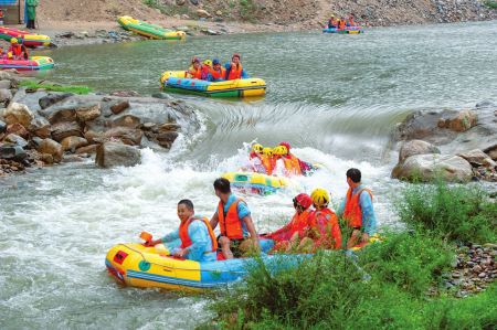 體驗完水上樂園后,張子良一行乘車來到位于中莊村的龐泉溝激情漂流。剛下車就看到了碼頭上熱鬧的景象,一艘艘漂流艇上坐滿了前來體驗的游客,大家穿著救生衣在工作人員的護送下向下漂流。偶爾遇到一處急流險灘,漂流艇隨著奔騰的水流飛馳而起,一眨眼的工夫就已落到了下一個平潭區(qū),游客們發(fā)出了陣陣尖叫。一路刺激,一路驚心,漂流給游客們留下了深刻的印象。負責該項目的閔玉貴介紹,項目選取了文峪河最精華的10公里河道,累計落差130米,平均水深0.8米,河道時寬時窄,水流時急時緩,沿途既有急流險灘,又有緩流碧潭,由于經(jīng)過了精心設(shè)計,且河道兩岸安排了上百名安全員護航,可以確保有驚無險。