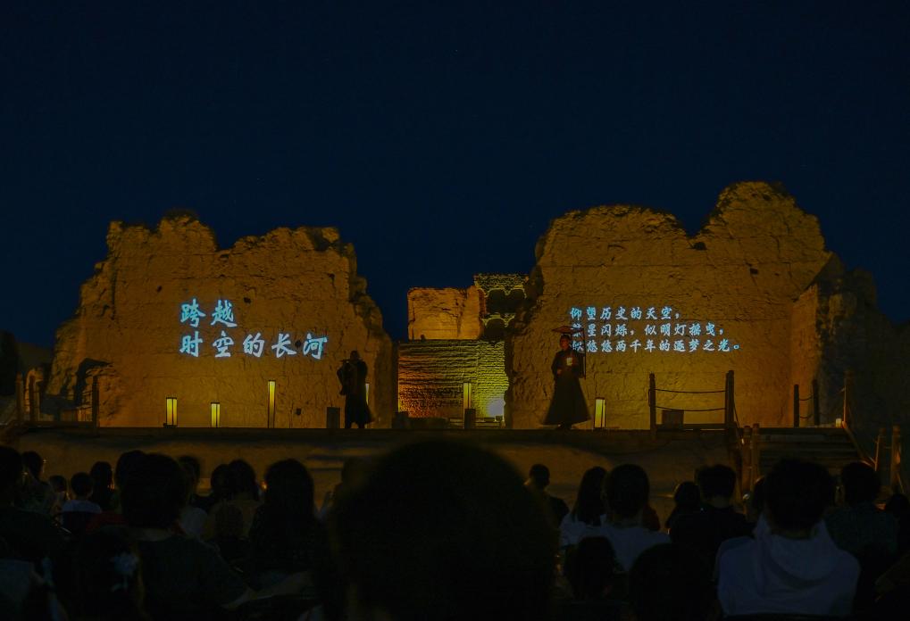 深藍(lán)色夜幕下,兩排戶(hù)外燈照亮高大殘舊的城墻。身著僧侶服飾的演員雙手合十、懷抱經(jīng)卷,從夜色中走來(lái)。時(shí)鐘隨著他的朗誦,仿佛回轉(zhuǎn)到佛教鼎盛期的唐代西域。在舞臺(tái)前方席地而坐的游客,看得如醉如癡。
