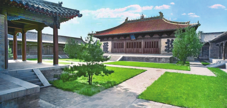 永安寺,原稱渾源州永安禪寺及神州大永安禪寺,俗稱“大寺”,始建于金,金元之交被火毀后重建,明、清以來(lái)均曾在當(dāng)?shù)毓賳T倡導(dǎo)下續(xù)建與增修。該寺位于渾源古城東北隅,坐西北朝東南,本為以中軸線為主,東西軸各輔以跨院或偏院的五進(jìn)場(chǎng)院空間大型寺廟建筑群,現(xiàn)僅存前院及東西跨院和中院主體建筑群,東西寬52米,南北深78米,占地面積4056平方米。寺內(nèi)現(xiàn)存文物建筑物7座、清代壁畫305.4平方米、建筑彩畫2118平方米,古代碑碣2方,石獅一對(duì)。主殿傳法正宗殿為元延祐二年(1315年)原構(gòu),是我國(guó)建筑史上廡殿頂建筑的杰作,殿內(nèi)滿堂水陸畫、建筑彩畫及殿頂五彩琉璃均保存完好且異常精美,聞名遐邇。