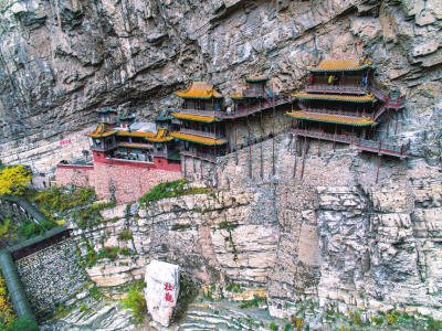懸空寺位于恒山第二主峰翠屏峰的半崖峭壁間,始建于北魏后期,距今已有1500多年的歷史。整個(gè)建筑上載危巖,下臨深谷,樓閣懸空,結(jié)構(gòu)奇巧,是我國(guó)古建筑中罕見的杰作,堪稱“天下一絕”。詩(shī)仙李白游懸空寺后揮毫寫下“壯觀”二字,以表其懷。明代旅行家徐霞客在其著作《徐霞客游記》中稱贊懸空寺為“天下巨觀”。歷史文化名城保護(hù)委員會(huì)副主任、著名文物專家鄭孝燮視察懸空寺后題詞:“懸空寺玄、絕、奇、險(xiǎn),百來(lái)百看不厭”。