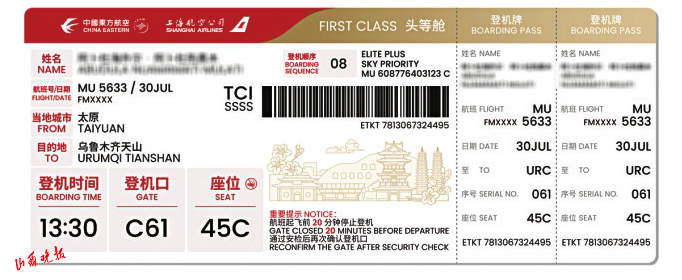 此次升級不僅注重文化表達(dá),更著力提升服務(wù)體驗(yàn)。登機(jī)牌對登機(jī)口、起飛時間、座位號等關(guān)鍵信息進(jìn)行了“放大提亮”處理,通過字體加粗、色彩對比等設(shè)計,顯著提升了信息辨識度,特別方便老年旅客快速獲取信息,有效降低誤機(jī)風(fēng)險,體現(xiàn)了東航精細(xì)化服務(wù)理念。