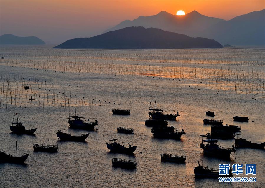 12月9日,夕陽西下,一艘漁船穿行在海上紫菜養(yǎng)殖架間。福建省寧德市的霞浦縣以美麗的淺海、灘涂聞名,豐富的旅游資源和人文資源一直是攝影師追逐的靈感所在。 新華社記者魏培全攝