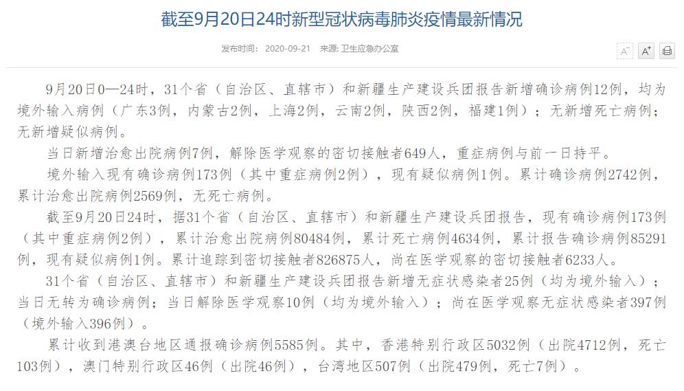 人民網(wǎng)北京9月21日電(董童)國家衛(wèi)生健康委于今日在官網(wǎng)發(fā)布的《截至9月20日24時新型冠狀病毒肺炎疫情最新情況》(以下簡稱“情況”)提出,9月20日0—24時,31個?。ㄗ灾螀^(qū)、直轄市)和新疆生產(chǎn)建設(shè)兵團報告新增確診病例12例,均為境外輸入病例(廣東3例,內(nèi)蒙古2例,上海2例,云南2例,陜西2例,福建1例);無新增死亡病例;無新增疑似病例。當日新增治愈出院病例7例,解除醫(yī)學觀察的密切接觸者649人,重癥病例與前一日持平。