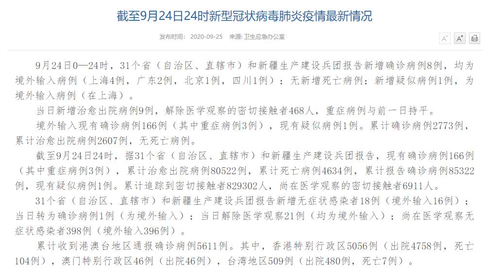 人民網(wǎng)北京9月25日電(董童)國家衛(wèi)生健康委于今日在官網(wǎng)發(fā)布的《截至9月24日24時新型冠狀病毒肺炎疫情最新情況》(以下簡稱“情況”)顯示,9月24日0—24時,31個?。ㄗ灾螀^(qū)、直轄市)和新疆生產(chǎn)建設(shè)兵團報告新增確診病例8例,均為境外輸入病例(上海4例,廣東2例,北京1例,四川1例);無新增死亡病例;新增疑似病例1例,為境外輸入病例(在上海)。當(dāng)日新增治愈出院病例9例,解除醫(yī)學(xué)觀察的密切接觸者468人,重癥病例與前一日持平。