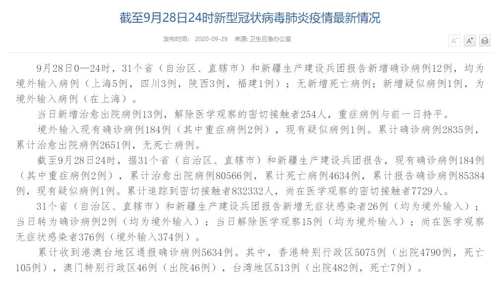 情況顯示,截至9月28日24時(shí),據(jù)31個(gè)省(自治區(qū)、直轄市)和新疆生產(chǎn)建設(shè)兵團(tuán)報(bào)告,現(xiàn)有確診病例184例(其中重癥病例2例),累計(jì)治愈出院病例80566例,累計(jì)死亡病例4634例,累計(jì)報(bào)告確診病例85384例,現(xiàn)有疑似病例1例。累計(jì)追蹤到密切接觸者832332人,尚在醫(yī)學(xué)觀(guān)察的密切接觸者7729人。