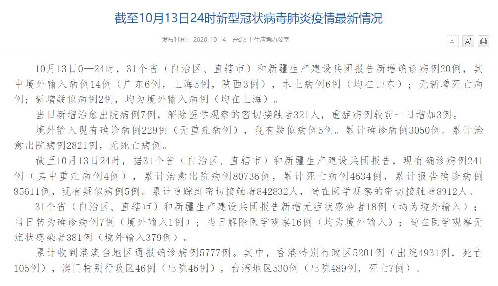人民網(wǎng)北京10月14日電(董童)國(guó)家衛(wèi)生健康委于今日在官網(wǎng)發(fā)布的《截至10月13日24時(shí)新型冠狀病毒肺炎疫情最新情況》(以下簡(jiǎn)稱“情況”)稱,10月13日0—24時(shí),31個(gè)?。ㄗ灾螀^(qū)、直轄市)和新疆生產(chǎn)建設(shè)兵團(tuán)報(bào)告新增確診病例20例,其中境外輸入病例14例(廣東6例,上海5例,陜西3例),本土病例6例(均在山東);無(wú)新增死亡病例;新增疑似病例2例,均為境外輸入病例(均在上海)。當(dāng)日新增治愈出院病例7例,解除醫(yī)學(xué)觀察的密切接觸者321人,重癥病例較前一日增加3例。