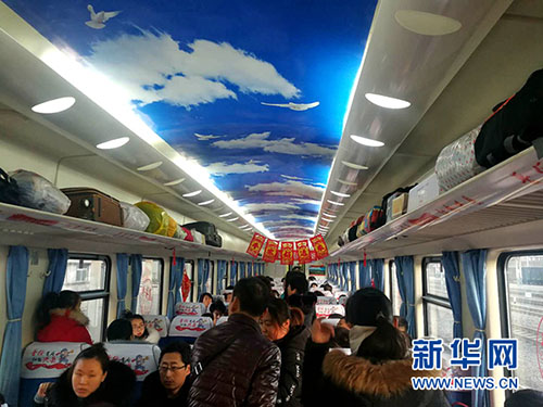 一首《十送紅軍》在車廂里回響,車窗上貼滿“福”字剪紙。扶貧火車“蔡家崖”號21日滿載旅客駛向呂梁山,迎來開通后的第一個春運。