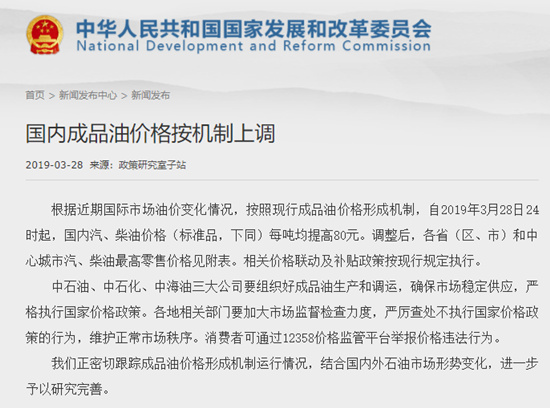 人民網(wǎng)北京3月28日電 (王紹紹) 國(guó)家發(fā)改委剛剛發(fā)布通知, 根據(jù)近期國(guó)際市場(chǎng)油價(jià)變化情況,按照現(xiàn)行成品油價(jià)格形成機(jī)制,自2019年3月28日24時(shí)起,國(guó)內(nèi)汽、柴油價(jià)格(標(biāo)準(zhǔn)品,下同)每噸均提高80元。調(diào)整后,各?。▍^(qū)、市)和中心城市汽、柴油最高零售價(jià)格見(jiàn)附表。相關(guān)價(jià)格聯(lián)動(dòng)及補(bǔ)貼政策按現(xiàn)行規(guī)定執(zhí)行。