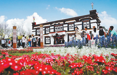 繼續(xù)向前,迎面而來的是格桑花田,這些花種全部從藏區(qū)草甸野外手工收集。一陣歡快的歌舞聲傳來,游客就來到了西藏園的核心區(qū)——吞巴民居。吞巴村是西藏自治區(qū)千年古村落之一,是藏香的發(fā)明人以及藏文創(chuàng)造者桑布扎的故鄉(xiāng)。這座小樓外觀延續(xù)了傳統(tǒng)的拉薩地區(qū)碉樓風(fēng)格,窗外的木陽臺上放著幾盆小花,充滿溫馨的氣息。