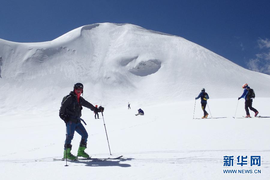 ↑記者第一次見到劉百靈是在第十六屆西藏登山大會滑雪登山項(xiàng)目的營地——洛堆峰雪線處,海拔5600米。劉百靈膚色黑得發(fā)亮,與身邊長年從事高山訓(xùn)練的藏族教練無異。但細(xì)問起來,他說自己生在湖南,現(xiàn)居杭州,是地道的南方人。 因?yàn)閷敉膺\(yùn)動(dòng)尤其是對滑雪的執(zhí)著,劉百靈的膚色變了,過起了旁人眼中的另一種人生,也成了“異類”。但他卻感謝自己成了“異類”。這是10月4日,滑雪愛好者、“體育旅游”探索者劉百靈(左)在位于西藏自治區(qū)當(dāng)雄縣羊八井鎮(zhèn)的洛堆峰雪坡上練習(xí),此處海拔約5700米。遠(yuǎn)處的山峰是海拔7048米的窮母崗日峰。 新華社發(fā)