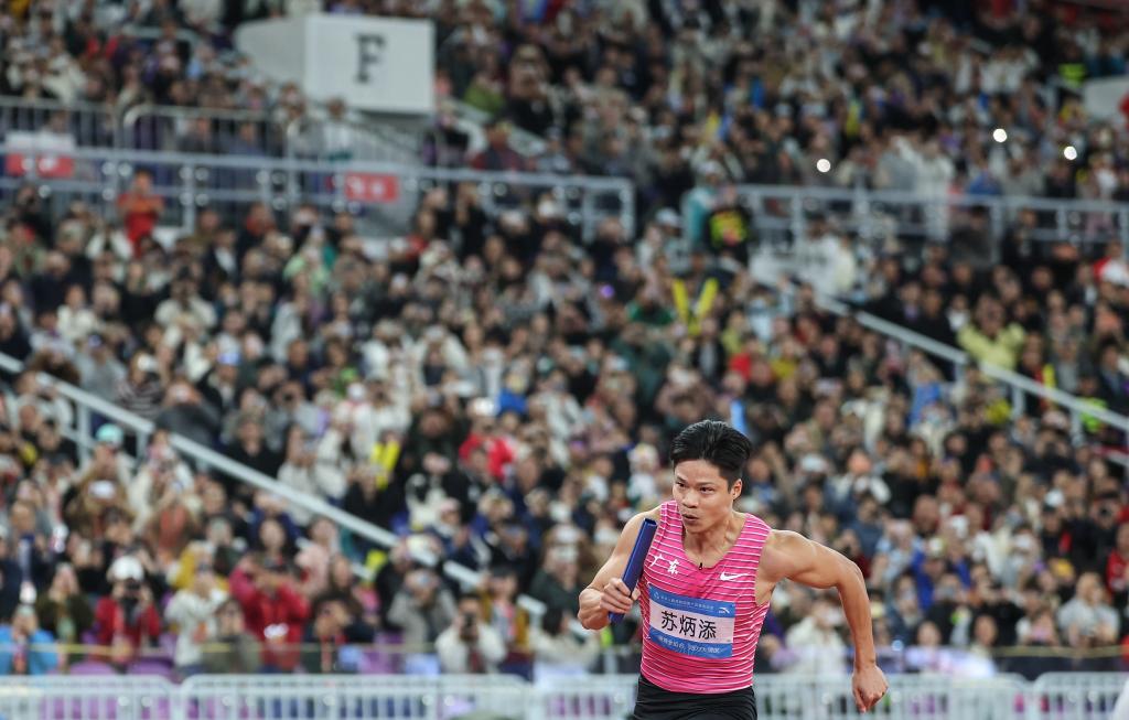 當(dāng)日,田徑項(xiàng)目依然是金牌大戶,共產(chǎn)生12枚金牌。36歲的男子100米亞洲紀(jì)錄保持者蘇炳添成為全場(chǎng)焦點(diǎn),他在家門口的賽道上跑完了職業(yè)生涯的最后100米,帶領(lǐng)一眾“00后”隊(duì)友為廣東隊(duì)奪得男子4×100米接力第四名。盡管未能幫助家鄉(xiāng)隊(duì)伍站上領(lǐng)獎(jiǎng)臺(tái),但蘇炳添仍贏得了滿場(chǎng)掌聲。