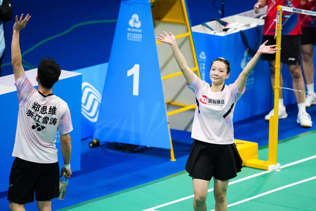 11月20日,浙江隊(duì)組合鄭思維/黃雅瓊(右)在奪冠后向觀眾致意。新華社記者 陳思汗 攝