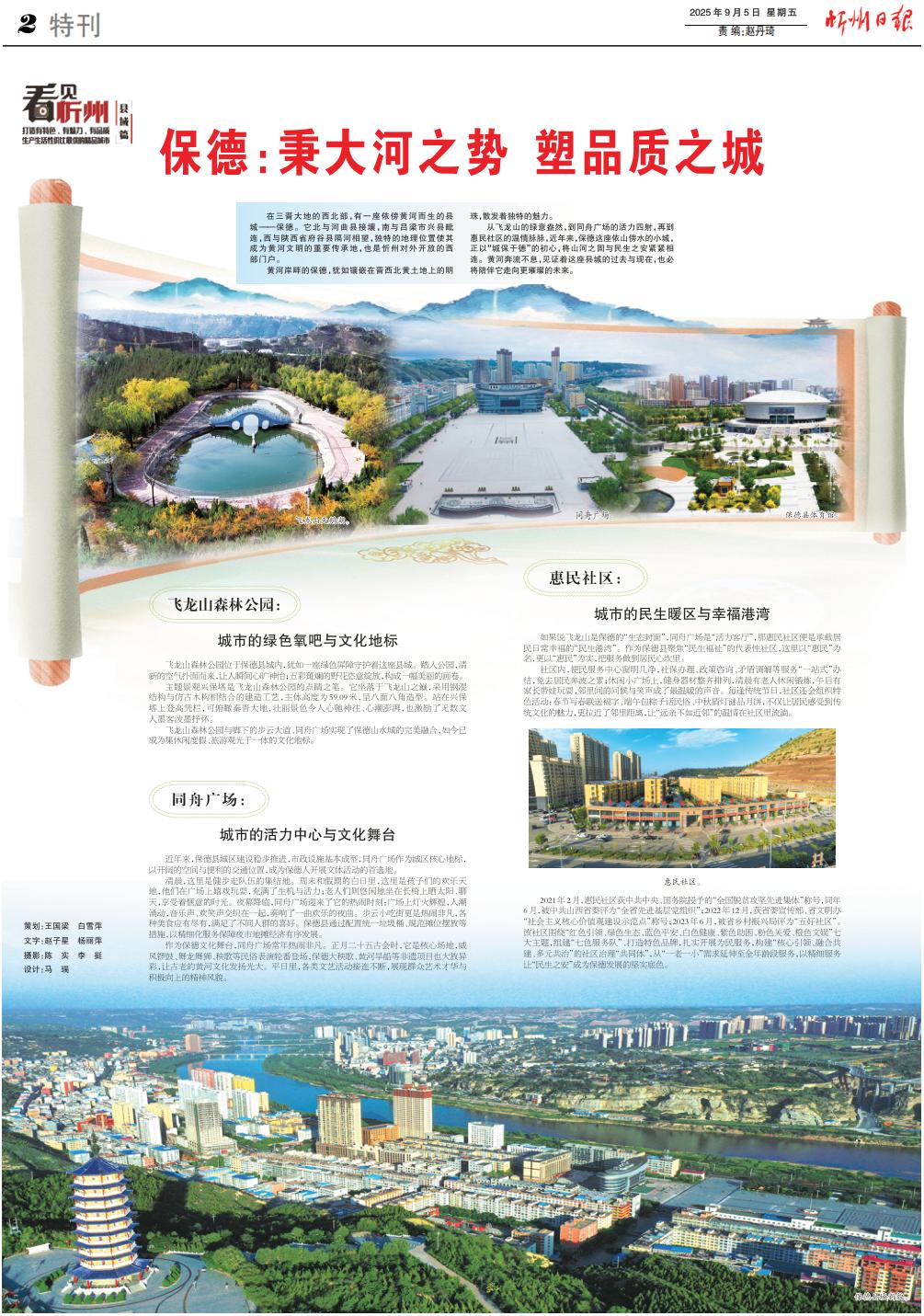 在三晉大地的西北部,有一座依傍黃河而生的縣城——保德。它北與河曲縣接壤,南與呂梁市興縣毗連,西與陜西省府谷縣隔河相望,獨(dú)特的地理位置使其成為黃河文明的重要傳承地,也是忻州對外開放的西部門戶。 黃河岸畔的保德,猶如鑲嵌在晉西北黃土地上的明珠,散發(fā)著獨(dú)特的魅力。 從飛龍山的綠意盎然,到同舟廣場的活力四射,再到惠民社區(qū)的溫情脈脈,近年來,保德這座依山傍水的小城,正以“城保于德”的初心,將山河之固與民生之安緊緊相連。黃河奔流不息,見證著這座縣城的過去與現(xiàn)在,也必將陪伴它走向更璀璨的未來。 飛龍山森林公園: 城市的綠色氧吧與文化地標(biāo) 飛龍山森林公園位于保德縣城內(nèi),猶如一座綠色屏障守護(hù)著這座縣城。踏入公園,清新的空氣撲面而來,讓人瞬間心曠神怡;五彩斑斕的野花恣意綻放,構(gòu)成一幅美麗的畫卷。 主題景觀興保塔是飛龍山森林公園的點(diǎn)睛之筆。它坐落于飛龍山之巔,采用鋼混結(jié)構(gòu)與仿古木構(gòu)相結(jié)合的建造工藝,主體高度為59.09米,呈八面八角造型。站在興保塔上登高憑欄,可俯瞰秦晉大地,壯麗景色令人心馳神往、心潮澎湃,也激勵了無數(shù)文人墨客潑墨抒懷。 飛龍山森林公園與腳下的步云大道、同舟廣場實(shí)現(xiàn)了保德山水城的完美融合,如今已成為集休閑度假、旅游觀光于一體的文化地標(biāo)。 同舟廣場: 城市的活力中心與文化舞臺 近年來,保德縣城區(qū)建設(shè)穩(wěn)步推進(jìn),市政設(shè)施基本成型,同舟廣場作為城區(qū)核心地標(biāo),以開闊的空間與便利的交通位置,成為保德人開展文體活動的首選地。 清晨,這里是健步走隊(duì)伍的集結(jié)地。周末和假期的白日里,這里是孩子們的歡樂天地,他們在廣場上嬉戲玩耍,充滿了生機(jī)與活力;老人們則悠閑地坐在長椅上曬太陽、聊天,享受著愜意的時(shí)光。夜幕降臨,同舟廣場迎來了它的熱鬧時(shí)刻:廣場上燈火輝煌,人潮涌動,音樂聲、歡笑聲交織在一起,奏響了一曲歡樂的夜曲。步云小吃街更是熱鬧非凡,各種美食應(yīng)有盡有,滿足了不同人群的喜好。保德縣通過配置統(tǒng)一垃圾桶、規(guī)范攤位擺放等措施,以精細(xì)化服務(wù)保障夜市地?cái)偨?jīng)濟(jì)有序發(fā)展。 作為保德文化舞臺,同舟廣場常年熱鬧非凡。正月二十五古會時(shí),它是核心場地,威風(fēng)鑼鼓、舞龍舞獅、秧歌等民俗表演輪番登場,保德大秧歌、黃河旱船等非遺項(xiàng)目也大放異彩,讓古老的黃河文化發(fā)揚(yáng)光大。平日里,各類文藝活動接連不斷,展現(xiàn)群眾藝術(shù)才華與積極向上的精神風(fēng)貌。