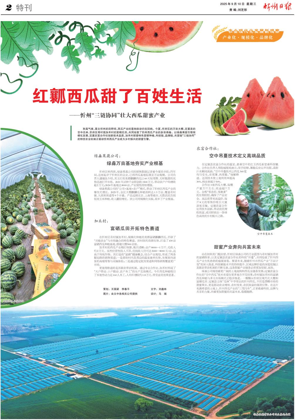 綠淼公司規(guī)劃著更廣闊的土地流轉(zhuǎn)和西瓜全鏈條發(fā)展;定襄農(nóng)富合作社的“空中西瓜”技術(shù)有望在更多地方開(kāi)花結(jié)果;奇村鎮(zhèn)加禾村的富硒西瓜種植與多元市場(chǎng)模式正穩(wěn)步推進(jìn)。一顆顆從忻府區(qū)現(xiàn)代化大棚和富硒瓜田、定襄縣立體“瓜林”中孕育出的忻州西瓜,不僅是饋贈(zèng)市場(chǎng)的甜蜜果實(shí),更是驅(qū)動(dòng)農(nóng)業(yè)增效、農(nóng)村變美、農(nóng)民致富的強(qiáng)勁引擎。在這片充滿(mǎn)希望的土地上,忻州西瓜產(chǎn)業(yè)的“三駕馬車(chē)”,正承載著科技、品牌與共享的力量,向著更加甜蜜的共富未來(lái),穩(wěn)健馳騁。