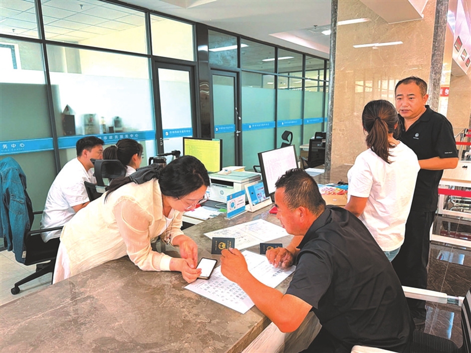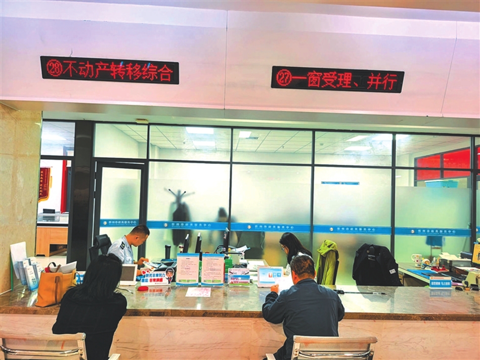 市政務(wù)大廳一樓不動(dòng)產(chǎn)轉(zhuǎn)移綜合窗口,實(shí)現(xiàn)稅務(wù)+不動(dòng)產(chǎn)登記一窗受理、并行辦理,日均辦理400件以上。