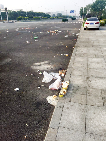 城區(qū)高鐵廣場前,慕山路與雁門大道丁字路口,每天晚上有小商販在此經(jīng)營,本無可厚非,但每天產(chǎn)生的垃圾,既影響市容環(huán)境,還給環(huán)衛(wèi)工人增加了工作量,呼吁市民及小商販愛護環(huán)境,也希望相關(guān)部門管理維護公共環(huán)境。一網(wǎng)友攝于8月22日