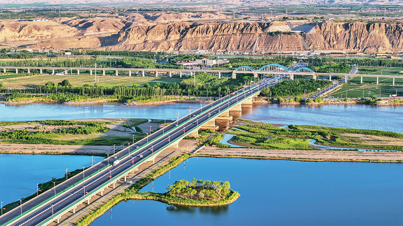 新時(shí)代生態(tài)文明建設(shè)的成就舉世矚目,成為新時(shí)代黨和國(guó)家事業(yè)取得歷史性成就、發(fā)生歷史性變革的顯著標(biāo)志。圖為2023年6月13日,位于寧夏中衛(wèi)的黃河公路大橋、黃河鐵路大橋與黃河濕地交相輝映,美麗如畫。人民圖片 柴更利/攝