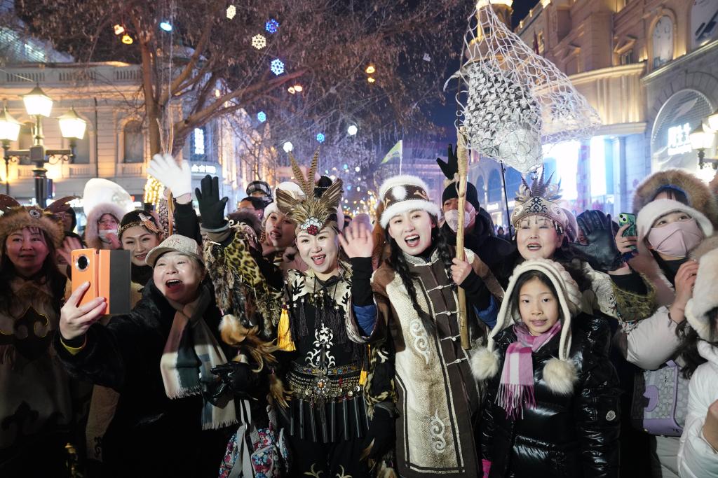 1月6日,身著赫哲族服飾的赫哲族群眾和饒河縣文旅推薦官在哈爾濱中央大街上與游客互動(dòng)。新華社記者王建威攝