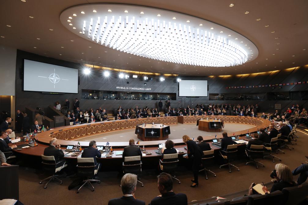 這是6月14日在比利時(shí)布魯塞爾北約總部拍攝的北約防長會現(xiàn)場。北約秘書長斯托爾滕貝格14日說,北約成員國國防部長當(dāng)天批準(zhǔn)了一項(xiàng)旨在由北約協(xié)調(diào)對烏克蘭軍事援助和訓(xùn)練的計(jì)劃。北約防長會13日至14日在布魯塞爾舉行。新華社記者趙丁喆攝