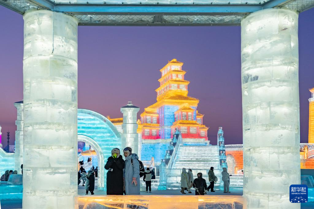 在哈爾濱冰雪大世界園區(qū),游客觀看第40屆中國·哈爾濱國際冰雪節(jié)開幕式(1月5日攝)。新華社記者 謝劍飛 攝