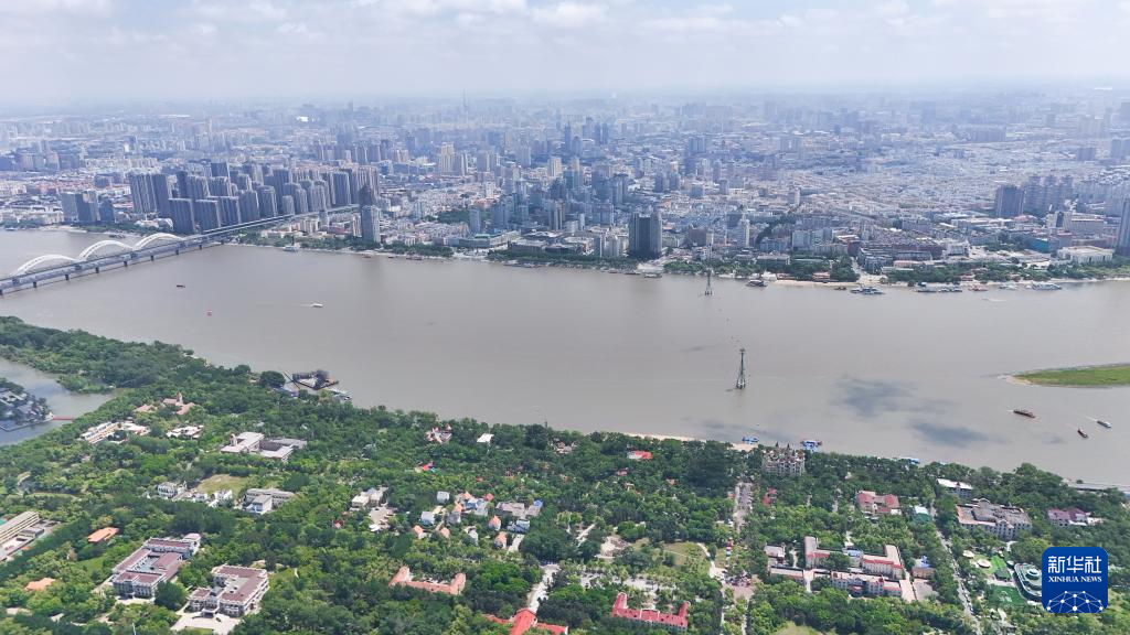 這是6月4日拍攝的哈爾濱市松花江北岸的太陽島國家濕地公園局部景色與對岸的局部城市景觀(無人機照片)。新華社記者 王松 攝