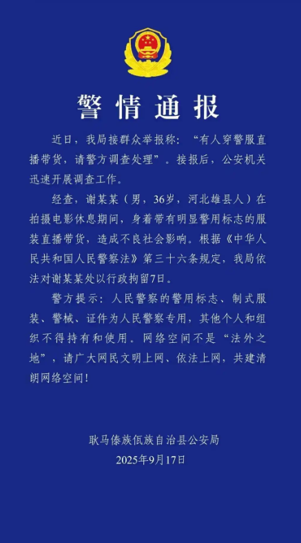 近日,演員謝孟偉(網(wǎng)絡(luò)俗稱“嘎子哥”)在直播帶貨過(guò)程中身穿警服,被公安機(jī)關(guān)依法處以行政拘留七日的處罰。該處理結(jié)果獲得輿論普遍支持,體現(xiàn)出社會(huì)對(duì)公權(quán)力象征符號(hào)神圣性的共同維護(hù)。據(jù)通報(bào),謝某在電影拍攝休息期間,身著配有警用標(biāo)志的制式警服公開(kāi)推銷電子產(chǎn)品,并聲稱“穿警服需通過(guò)政審”“公安機(jī)關(guān)應(yīng)當(dāng)配合工作”,企圖利用警服所承載的公信力為其商業(yè)行為背書(shū)。