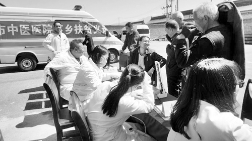 胡家溝村有貧困戶80戶。市委老干部局從2015年開始進行幫扶,緊緊圍繞“一戶一名技術(shù)工,做好精準(zhǔn)扶貧”的工作思路,在技能培訓(xùn)、項目實施、基礎(chǔ)建設(shè)、教育援助、文藝活動等方面開展了大量卓有成效的工作,在2016年底取得了整村脫貧的好成績。這次健康扶貧行動,是市委老干部局認(rèn)真貫徹全市脫貧攻堅大會精神,鞏固成績、持續(xù)發(fā)力,不斷推進幫扶成果的具體體現(xiàn)。針對村民對疾病預(yù)防和治療方面的需求,市委老干部局聯(lián)系市中醫(yī)院組織了義診活動。市中醫(yī)院內(nèi)科、外科、心內(nèi)科等多個科室的9名醫(yī)務(wù)骨干和老專家,為貧困村民把脈問診、開方治療,使106名村民得到診療。