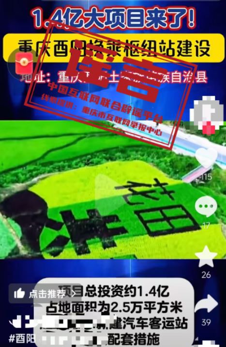 真相:近日,有網(wǎng)民發(fā)布信息稱“1.4億大項目來了,重慶酉陽換乘樞紐站建設(shè),新建汽車客運(yùn)站及相關(guān)配套”,引發(fā)關(guān)注。經(jīng)重慶市酉陽縣交通運(yùn)輸委核實(shí),酉陽縣正在推進(jìn)桃花源景區(qū)游客集散中心提升項目,暫無“1.4億建設(shè)換乘樞紐站”項目,網(wǎng)傳信息系謠言。(來源:“重慶辟謠”微信公眾號)