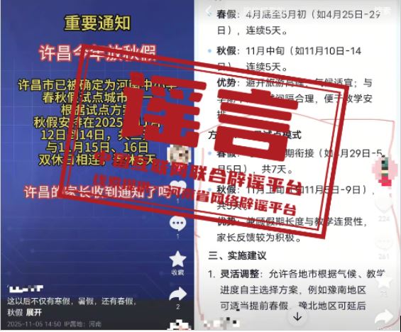 真相:近日,河南、安徽部分自媒體平臺發(fā)布關(guān)于中小學(xué)春秋放假的信息,聲稱“許昌市已被確定為河南中小學(xué)春秋假試點城市之一”“周口市中小學(xué)2025年秋假時間安排如下”“蕪湖市中小學(xué)將在11月12日至14日放首個秋假,連周末共5天”,引發(fā)關(guān)注。對此,河南許昌、周口及安徽蕪湖教育部門作出回應(yīng):并無放秋假的安排,網(wǎng)傳消息均為謠言。中小學(xué)放假安排需嚴格遵循國家教育方針政策及當?shù)亟逃块T的統(tǒng)一部署,結(jié)合本地教育教學(xué)實際統(tǒng)籌規(guī)劃。如需了解相關(guān)安排,請通過屬地教育部門官方網(wǎng)站,切勿輕信、傳播未經(jīng)官方確認的“小道消息”。(來源:“清朗河南”微信公眾號、@大河網(wǎng)、安徽網(wǎng)絡(luò)辟謠平臺)