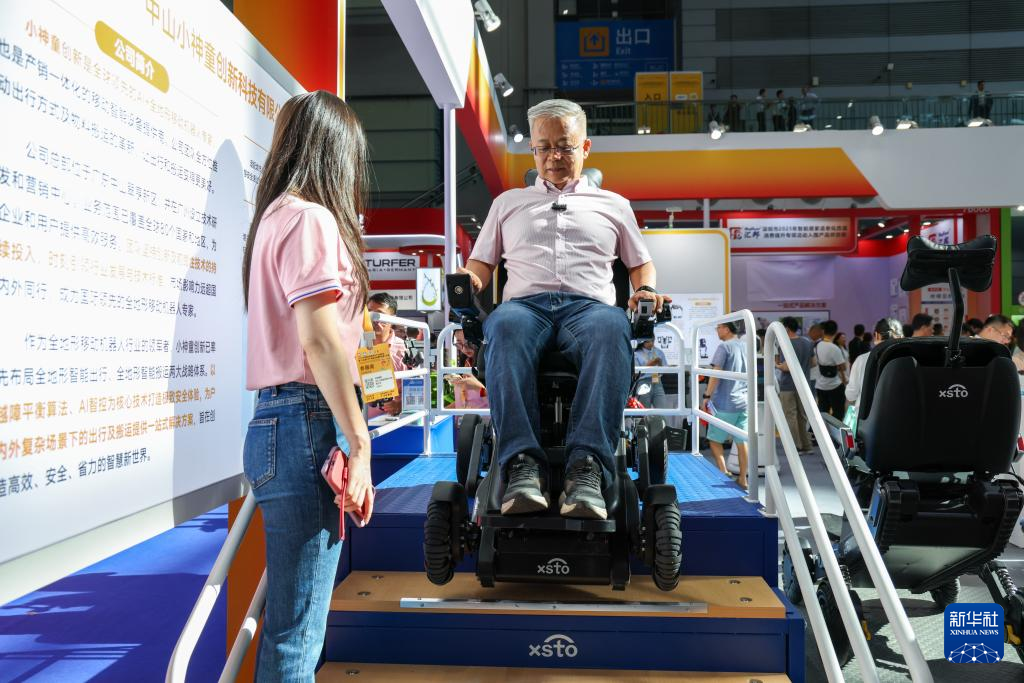 9月12日,觀眾在國際智慧養(yǎng)老產業(yè)博覽會現(xiàn)場體驗智能出行機器人。新華社記者 梁旭 攝
