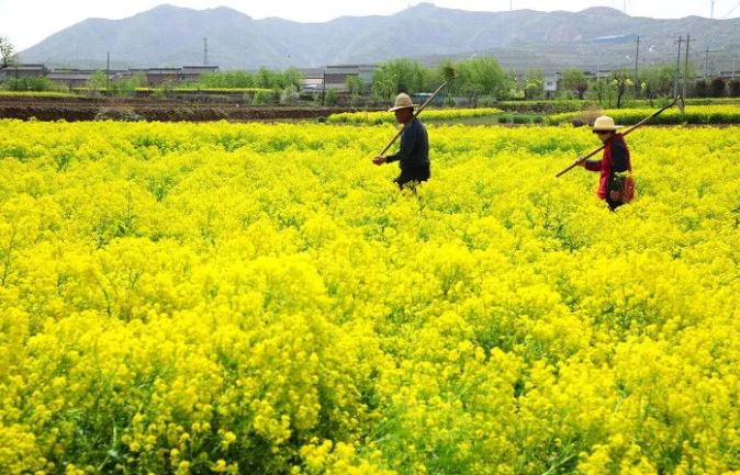4月14日,在萬(wàn)榮縣西村鄉(xiāng)望囑村的板藍(lán)根花地里游人在踏青賞花,親近自然。西村鄉(xiāng)到處都是板藍(lán)根花開(kāi)放,競(jìng)相爭(zhēng)艷,連成一片花?!?/p>