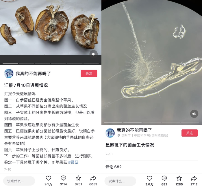 拿到樣本后,許博士對(duì)蘋(píng)果做了切片觀察,還在抖音上向網(wǎng)友實(shí)時(shí)更新起了菌絲生長(zhǎng)情況,引發(fā)越來(lái)越多網(wǎng)友的“追更”。之后又有科普創(chuàng)作者@植物眼 專門(mén)采訪許博士的導(dǎo)師趙琪,他的細(xì)致講解讓很多網(wǎng)友紛紛表示“又學(xué)到了新知識(shí)”。