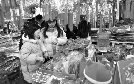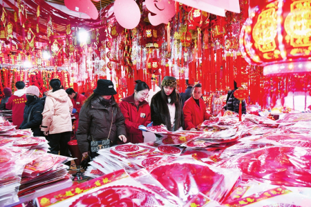 “今年蛇年,對聯(lián)和掛飾肯定以蛇元素為主,品類更加豐富,背膠和磁吸設(shè)計(jì),掛貼更為方便?!痹谔炒筚u場,邢先生售賣春聯(lián)和窗花、燈籠等各類春節(jié)掛飾20多年了,一副副大紅的春聯(lián)掛滿了兩面墻壁,各類福字和掛飾鋪滿了整個(gè)攤位,顧客們正在選購自己喜歡的春聯(lián)和掛飾。他說,今年的春聯(lián)和春節(jié)掛飾有大幾百種,豐富多樣。臘八過后,來購買對聯(lián)和過年掛飾的人就開始多了起來,預(yù)計(jì)年前一周左右會達(dá)到高峰。
