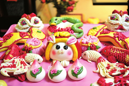 “生肖青蛇臥盤,雙春蛇年生機(jī)盎然;醒獅賀歲,歲歲平安;花開富貴葫蘆,福祿到家;可愛的醒獅兔,蛇盤兔代代富;平安扣青枝上盛開梅花,寓意花開富貴、孕育希望、生機(jī)盎然;可愛福袋,寓意代代有福、福氣滿滿;大紅錦鯉寓意好運(yùn)連連……”馮秀說,今年的花饃圍繞“金蛇送?!边@一主題,設(shè)計(jì)了近20個(gè)品種,每款花饃都寓意吉祥和美好祝福。每一款非遺花饃的創(chuàng)意都是基于傳統(tǒng)文化,都是對傳統(tǒng)文化的致敬,也是人們對美好生活的期待和向往,“過年買花饃是吃在嘴里的年味兒,充滿了幸福感,我的花饃顧客來自全國各地,有的連續(xù)多年定制,成為了老朋友?!?/p>