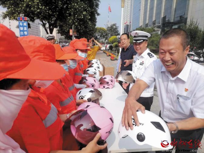 今年是我市創(chuàng)建全國文明城市的決戰(zhàn)決勝年,廣大環(huán)衛(wèi)工人一直默默奮斗在崗位上,為我市創(chuàng)文不斷努力。市公安局交警支隊始終牽掛著奮戰(zhàn)在基層一線的環(huán)衛(wèi)工人,支隊以此次贈送頭盔活動為契機(jī),持續(xù)關(guān)心關(guān)愛環(huán)衛(wèi)工人的生命安全和身體健康。市公安局交警支隊負(fù)責(zé)人表示:“環(huán)衛(wèi)工人大多騎著電動三輪車或人力保潔車穿梭在大街小巷,機(jī)動車道是他們的主要作業(yè)區(qū)之一,佩戴安全頭盔,可以大大增加他們的安全系數(shù)。同時,環(huán)衛(wèi)等重點(diǎn)行業(yè)的示范引領(lǐng)作用,將有力帶動市民遵紀(jì)守法、安全出行,為文明城市創(chuàng)建打造一道亮麗的風(fēng)景線。”圖為捐贈活動現(xiàn)場。張志遠(yuǎn) 攝影報道