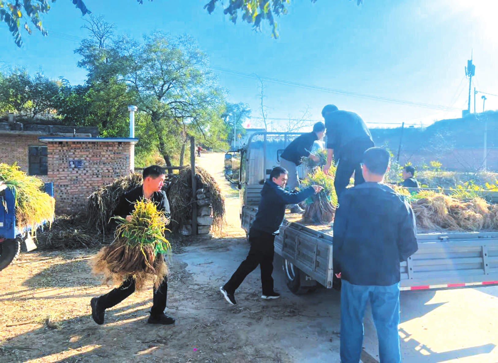 村里的部分孤寡老人,子女不在身邊,又缺乏交通工具,辛苦種植的紅蔥只能依賴商販來村定點(diǎn)收購(gòu),價(jià)格也不太理想。駐村第一書記阮傳飛說:“不能讓老百姓的汗白流,我們作為駐村的黨校人要行動(dòng)起來!”于是帶領(lǐng)隊(duì)員們化身“快遞員、裝卸工”,開著貨車與村干部一起來到農(nóng)戶門前,直接將紅蔥裝車運(yùn)往忻州市區(qū)銷售,打通紅蔥從農(nóng)田到餐桌的直銷通道。隊(duì)員們分工協(xié)作,稱重、捆綁、搬運(yùn)、碼放,汗水混著泥土浸濕了衣背卻無人停歇。一上午的工夫,就裝了滿滿一車。顧不得短暫休息,隊(duì)員們又馬不停蹄地趕往市區(qū),爭(zhēng)取在天黑前運(yùn)回市里進(jìn)行售賣。丁家溝75歲的焦大爺激動(dòng)地說:“多虧了這些駐村干部和年輕同志,要不是他們幫我想辦法,我這些蔥得啥時(shí)候才能賣出去啊!”
