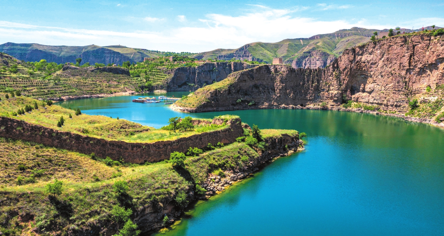 從壺口到禹門口,沿途有不少觀景臺,下臨深谷,白浪翻卷,水聲響亮。黃河泛黃時(shí)候,觀景臺上只聞水聲轟鳴,看不出浪花。此時(shí)黃河清,白浪顯,成了新景。抵達(dá)禹門口,黃河也是綠的,游艇在河里開過,水面上劃出道道波紋,宛如鋪展著的巨幅油畫。