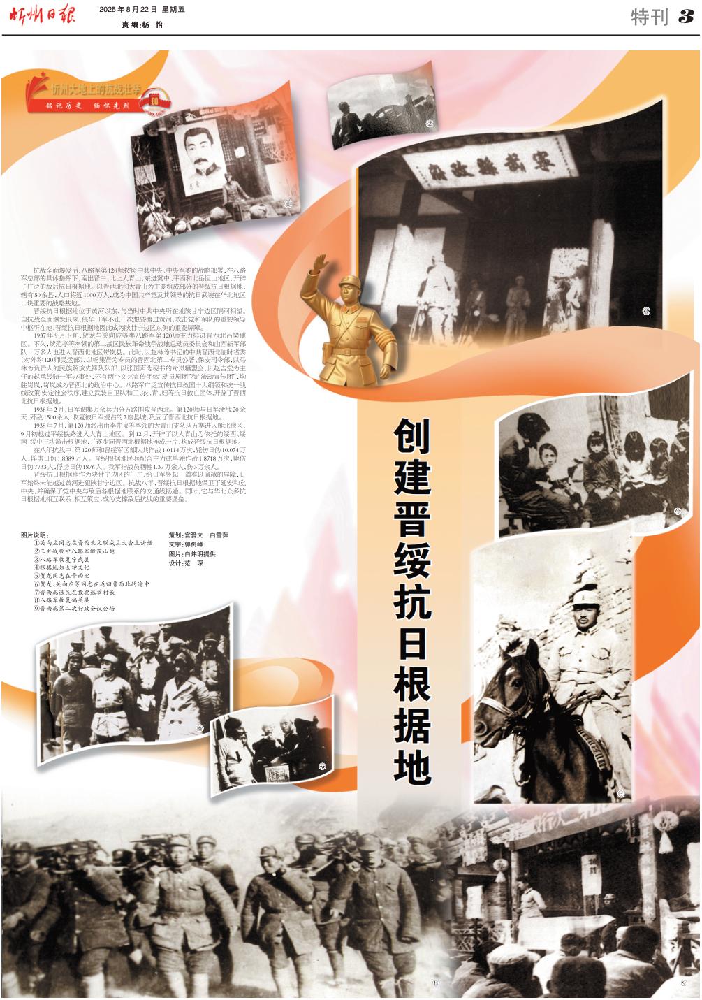 抗戰(zhàn)全面爆發(fā)后,八路軍第120師按照中共中央、中央軍委的戰(zhàn)略部署,在八路軍總部的具體指揮下,南出晉中,北上大青山,東進(jìn)冀中、平西和北岳恒山地區(qū),開辟了廣泛的敵后抗日根據(jù)地。以晉西北和大青山為主要組成部分的晉綏抗日根據(jù)地,轄有50余縣,人口將近1000萬人,成為中國共產(chǎn)黨及其領(lǐng)導(dǎo)的抗日武裝在華北地區(qū)一塊重要的戰(zhàn)略基地。 晉綏抗日根據(jù)地位于黃河以東,與當(dāng)時(shí)中共中央所在地陜甘寧邊區(qū)隔河相望。自抗戰(zhàn)全面爆發(fā)以來,侵華日軍不止一次想要渡過黃河,攻擊黨和軍隊(duì)的重要領(lǐng)導(dǎo)中樞所在地,晉綏抗日根據(jù)地因此成為陜甘寧邊區(qū)東側(cè)的重要屏障。 1937年9月下旬,賀龍與關(guān)向應(yīng)等率八路軍第120師主力挺進(jìn)晉西北呂梁地區(qū)。不久,續(xù)范亭等率領(lǐng)的第二戰(zhàn)區(qū)民族革命戰(zhàn)爭戰(zhàn)地總動(dòng)員委員會(huì)和山西新軍部隊(duì)一萬多人也進(jìn)入晉西北地區(qū)岢嵐縣。此時(shí),以趙林為書記的中共晉西北臨時(shí)省委(對(duì)外稱120師民運(yùn)部),以楊集賢為專員的晉西北第二專員公署、保安司令部,以馬林為負(fù)責(zé)人的民族解放先鋒隊(duì)隊(duì)部,以張國聲為秘書的岢嵐?fàn)廾藭?huì),以趙吉堂為主任的趙承綬騎一軍辦事處,還有兩個(gè)文藝宣傳團(tuán)體“動(dòng)員劇團(tuán)”和“流動(dòng)宣傳團(tuán)”,均駐岢嵐,岢嵐成為晉西北的政治中心。八路軍廣泛宣傳抗日救國十大綱領(lǐng)和統(tǒng)一戰(zhàn)線政策,安定社會(huì)秩序,建立武裝自衛(wèi)隊(duì)和工、農(nóng)、青、婦等抗日救亡團(tuán)體,開辟了晉西北抗日根據(jù)地。 1938年2月,日軍調(diào)集萬余兵力分五路圍攻晉西北。第120師與日軍激戰(zhàn)20余天,殲敵1500余人,收復(fù)被日軍侵占的7座縣城,鞏固了晉西北抗日根據(jù)地。 1938年7月,第120師派出由李井泉等率領(lǐng)的大青山支隊(duì)從五寨進(jìn)入雁北地區(qū),9月初越過平綏鐵路進(jìn)入大青山地區(qū)。到12月,開辟了以大青山為依托的綏西、綏南、綏中三塊游擊根據(jù)地,并逐步同晉西北根據(jù)地連成一片,構(gòu)成晉綏抗日根據(jù)地。 在八年抗戰(zhàn)中,第120師和晉綏軍區(qū)部隊(duì)共作戰(zhàn)1.0114萬次,斃傷日偽10.074萬人,俘虜日偽1.8389萬人。晉綏根據(jù)地民兵配合主力或單獨(dú)作戰(zhàn)1.8718萬次,斃傷日偽7733人,俘虜日偽1876人。我軍指戰(zhàn)員犧牲1.37萬余人,傷3萬余人。 晉綏抗日根據(jù)地作為陜甘寧邊區(qū)的門戶,給日軍豎起一道難以逾越的屏障,日軍始終未能越過黃河進(jìn)犯陜甘寧邊區(qū)??箲?zhàn)八年,晉綏抗日根據(jù)地保衛(wèi)了延安和黨中央,并確保了黨中央與敵后各根據(jù)地聯(lián)系的交通線暢通。同時(shí),它與華北眾多抗日根據(jù)地相互聯(lián)系、相互策應(yīng),成為支撐敵后抗戰(zhàn)的重要堡壘。 策劃:宮愛文 白雪萍 文字:郭劍峰 圖片:白煒明提供 設(shè)計(jì):范琛 (責(zé)任編輯:盧相汀) |