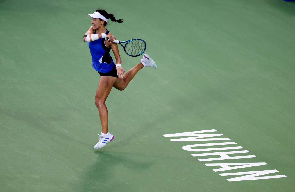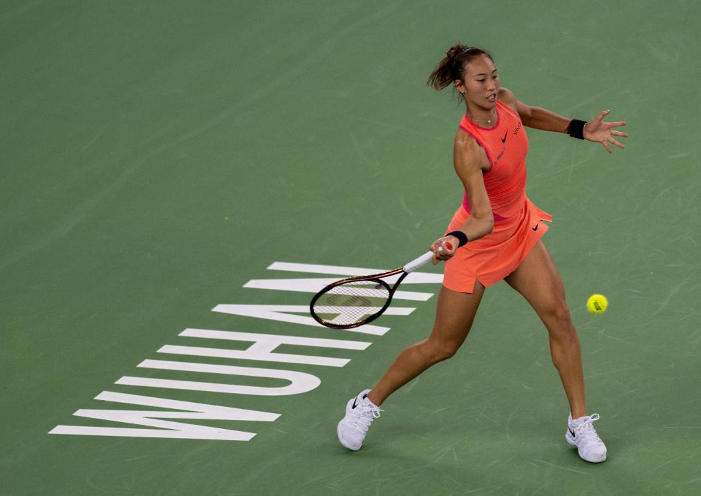 10月9日,鄭欽文在比賽中回球。新華社記者 胡競文 攝