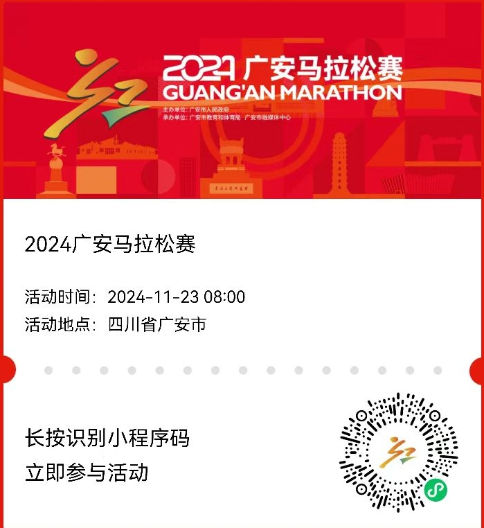 2024廣安馬拉松由中國田徑協(xié)會認證,廣安市人民政府主辦。賽事以“共富思源 奔跑廣安”為主題,規(guī)模20000人,共設(shè)置馬拉松(42.195公里)、半程馬拉松(21.0975公里)及歡樂跑(5公里)三個競賽項目。其中,馬拉松項目限報3000人,半程馬拉松項目限報7000人,歡樂跑項目限報10000人,各項目均報滿即止。本屆賽事除公開線上報名外,還將邀請全國媒體跑團、企業(yè)家跑團、知名人士跑團、川渝高校跑團、社會跑團等組成跑團方陣,為成渝地區(qū)雙城經(jīng)濟圈建設(shè)助陣。